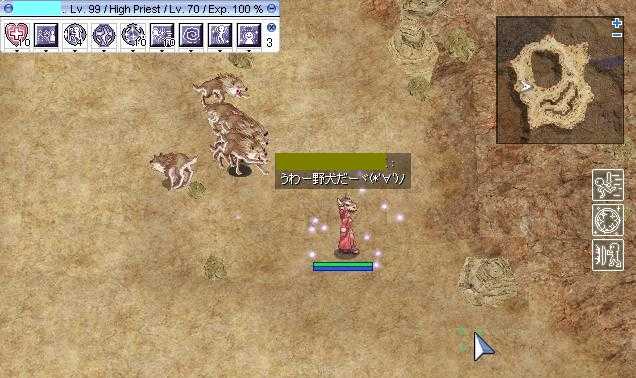 (3月3日(火)の日記です) こんばんはヾ(*'∀')ノ 幼保園のお仕事はすごくやりがいがあります。 他の人から見れば子どもと遊んで 毎日毎日やることも変わらないって感じなのでしょうけど。 ただやっぱり人は一人一人違うから その時の対応が後から考えると おかしかったかなぁと思うときもあるのです。 でもどんなことがあっても子どもたちには そんな暗い顔したりやネガティブなことはいえないし言わないよヾ(*'∀')ノ さて今日のROは 野犬に追われました。 小さい頃に犬に追いかけられてから 未だに大きな犬には恐怖心があるのですが 私を追いかけてた犬をお兄ちゃんが追いついて 追い払ってくれたのでいい思い出でもあります。 あと猿を殴ってちょっと問題にry ってことで砂漠狼の爪をゲットして青い魚ゲットです(`・ω・´) 砂漠狼って今ベインス近くにしかいないのですね。 昔いたプロ↓↓↓付近にいくと狭間1にでまくって すごく時間消費しました(ノー`) ベインスのいい男ヾ(*'∀')ノ しかしいつまでも終わらない引越しの準備。 モロク魔王クエストも完全に終わらせます。 深夜は久々に夜のギルドの溜まり場へ。 行き先がアビスだったので遠慮して溜まり場の人と 雑談しました。 なかなか有意義な雑談でしたヾ(*'∀')ノ でもまだこのGではアビスに行きたくないというわがままな私でした。 今日はここまで じゃあの(*・ω・)ノ