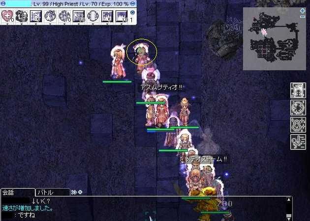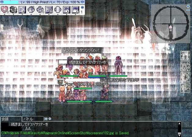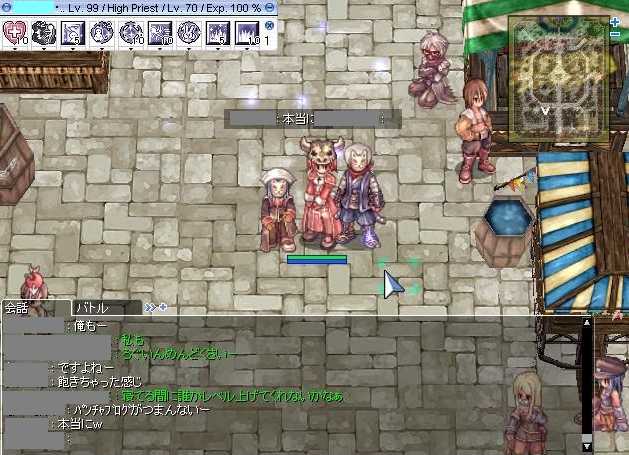 (4月11日(土)の日記です) こんばんはヾ(*'∀')ノ さて早速ROへー。 汚いシロマは今のところすごく強敵です。 課金AGI料理を使わないと倒せません(ノー`) でもいずれ弱く感じるのでしょうね。 予定としてはベース80で汚いシロマ95%フリーに なれるのでそこからフリー200、ASPD175にして 名刺を最低でも3枚貰ってから3Fへの狩りへ行くつもりです。 まだまだ先は長いです。 夜はギルド狩りの前に SバちゃんとMリーさんにあいました。 ブログどうやったらつまるようになりますかねー。 難しいですよねー。 あくまでも記録としてつけてるとはいえ 確かに読んでもらったりコメントしてもらうと 嬉しいですしモチベーションUPにもなるから 何とか面白くしたいんですけどねー。 リアルのこと書いて面白くなるかわからないし もしそれで面白くてもそれはそれで違うような 気がするんですよねー。 そしてよくみると先日のくじの狐仮面。 これ怖いですね。 同じくくじの海賊の短剣もくじ中は5Mで どうせすぐに暴落するからあとで 買おうと思ってたら今は最安値が8Mとかでした(ノー`) でもくじ初日で狐仮面・短剣共に5個ずつ並べてる人とか いたら勘違いするよねo(`ω´*)o 今日のギルド狩りは合同ギルド狩りでした。 大人数でジュピ3へ。 遠足みたいですよね。 そして黄色く囲ってるHPのTルノさんが何か 幽霊みたいになってるのは気のせいかな かなかな(・ω・) もしかしたらスタンド発現中かもしれん。 記念SSととったあとはヴェスパー所長と戦いました。 MVPだから仕方がないとはいえ何人か 死なせてしまったのが(´・ω・`)でした。 てか全滅寸前までいったんだった。 あとアサシンさんやハンターさんを ほんとにすぐ死なせたのが(ノー`)ですね。 盾もてないで未転生だからなのもあるのですけど やっぱり死なせるときもちいいものじゃないですよね(ノー`) 嫌いな人とかじゃないし^^ さて今週のパンドラがナビゲートする「かわいいは正義」。 今週はここまでです。 番組ではリスナーの皆さんのリクエスト、 してほしい企画を常時募集しています。 何か思いついたことや簡単なことなんでもいいので お気軽にFAX・Eメールなのでお送りください。 では、来週のこの時間にまたお逢いしましょう byebye =D