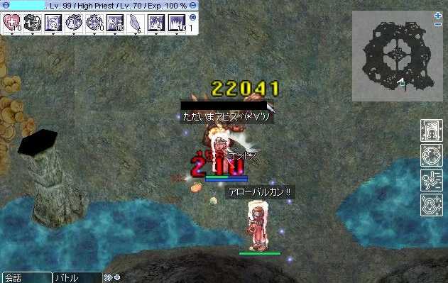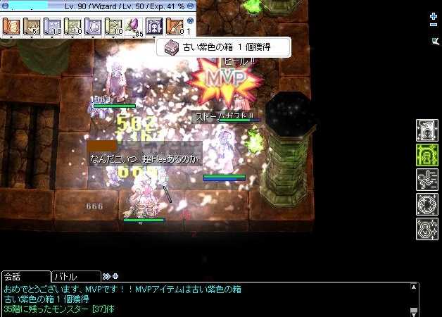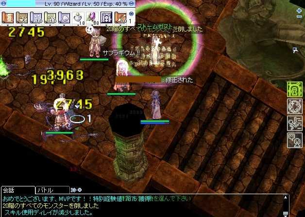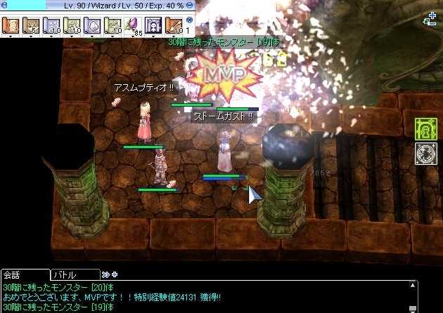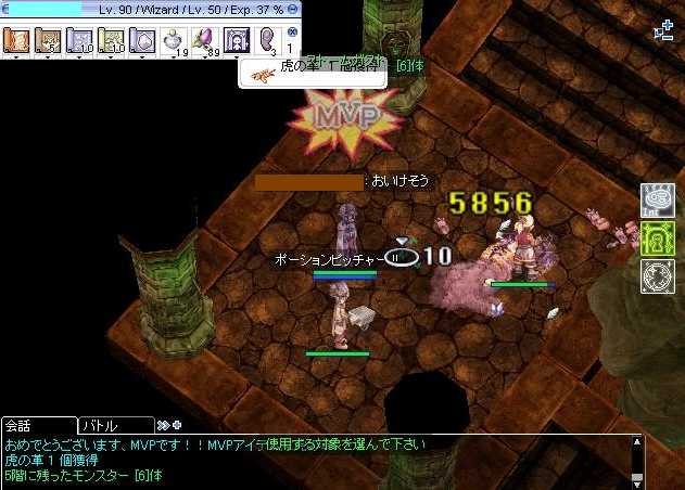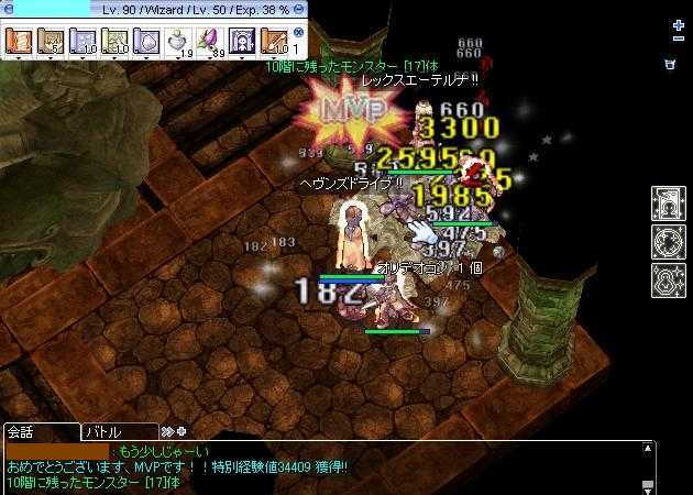 (5月12日(火の日記です) こんばんはヾ(*'∀')ノ バ○ナが一本ありました~ あ~おいみなみのそらの○たぁ~ ではじまるバナナの歌。 幼保園でもよく歌いますけど これSMAPの香取慎吾がCMしてますよね。 あのバナナ聖人みたいなかっこうで で同じくSMAPの草ナギ剛が裸で踊った事件後 SMAステーションで慎吾が冒頭で謝ったのですけど その直後のCMがそのバナナ聖人のCMだったらしく 動画サイトでみたら本当で思わず吹きました。 まぁもう削除してみることは出来ないのですけど 2CHコピペブログに載りだしてそれ見て30分後にまた 見ようとしたら削除されてるくらい早かったです。 でも削除要請するくらいならCMの順番とか変えればいいのに(・э・) さて今日のRO ソロは舞しか出来ないのでアビスに再び帰ってきました。 レアは出なかったです。 そしてギルド狩り。 ひさびに時間前から待機してると TルノさんとBルさんの3人だけだった。 どうしようかぁと話したりしてTルノさんが落ちられると Yーリさんのメッセが上がりBルさんが落ちられると Y-リさんがログインされてきました。 そしてMリーさんもこられ3人でノリでETにいくことに。 前衛;Y-リさん王者金剛 後衛;私WIZ SG・LOV 回復;Mリーさんケミ というトリッキーな構成で行ってきました。 エドガ倒せましたヾ(*'∀')ノ でもミストレスで詰むだろうなと思っていると 4FでIツクさんがなんとHPで来てくれました。 まさしく「HPkt これで勝つる」状態でした(*゚∀゚)=3ムハー ミストレスも倒せました。 マヤーも倒せたよヾ(*'∀')ノ ドレイクもry フリオニも倒せたよヾ(*'∀')ノ フリオニって範囲石化?してくるんですね。 初めて知りました。 ミストレスも範囲沈黙してくるの初めて知りました。 亀将軍もry しかし40Fで入り口近くに ハティと嵐がいたので終わりました(ノー`) やっぱりSP吸収とスタンはいたいですね。 そして今日だけで今までとったMVPの回数を越えました。 久々に火力職を出しましたけど 確かにこれは楽しいだろうなぁと思いました。 なんだかんだいってかなり登れたET。 とても楽しめました。 今日はここまで じゃあの(。・-・)ノ