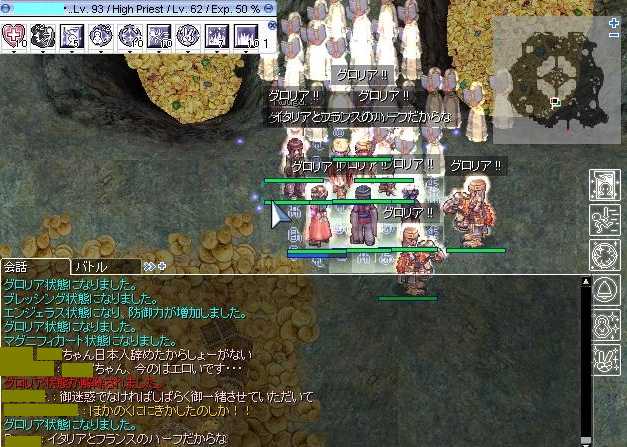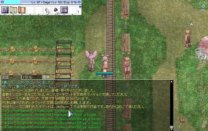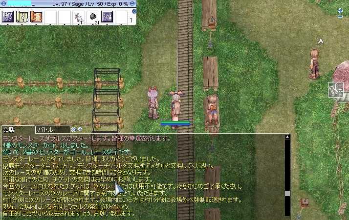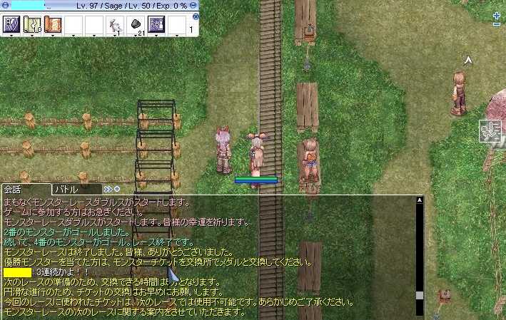 (7月5日(日)の日記です) こんばんはヾ(*'∀')ノ 今日は明日からプール開きということで 水泳教室のコーチの人を呼んで講習とかをしました。 人工呼吸とかそういったものですね。 本当は1日がプール開きだったのですが 当日は雨が降ることが初めからわかっていたので 6日の月曜日からです。 最後に若い職員だけ集まって写真取ろうとしてましたけど みんな遊ぶのに夢中でなかなか大変でした。 みんなまだまだ若いしのう(ΦωΦ) ともあれ明日からプールが始まるので 事故のないようにしたいと思います。 そしてプールの責任者が私になってるのは 陰謀に違いないo(`ω´*)o さて今日のRO 夜の集いの深夜狩りはアビスでした。 そして発見したことがあるのです。 前衛さんが二人いるときは時給が大幅に跳ね上がるのです。 一人だと時給2M程ですが二人だと軽く倍は出るのです。 そして狩りの後はMVP探し。 DL何とか撃破ヾ(*'∀')ノ この落ち着きがないMVPも撃破ヾ(*'∀')ノ そして今日はアビス狩りのときには 2PCでセージは連れて行かなかったのですが その裏ではフィゲルでレースをしてました(ΦωΦ) 私は常に1-2でかけているのですが ではその一部始終を見よヾ(*'∀')ノ 4回続けて2-4が来ました(*。◇。) 2-4固定賭けの人はヤッタネヾ(*'∀')ノ 今日はここまで じゃあの(*・ω・)ノ