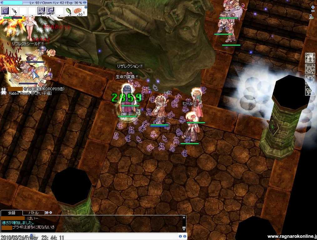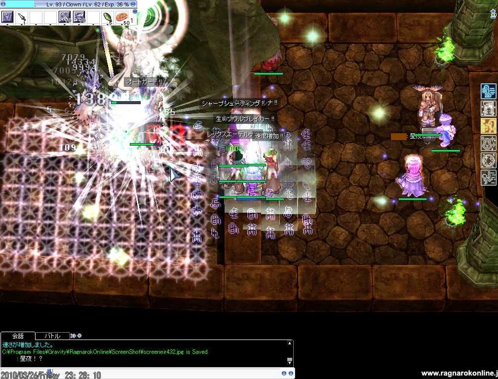 こんばんはヾ(*'∀')ノ PCとかうってると文字のフォントとかに慣れますよね。 人の書く字によってはそのまんまフォントに使えるんじゃね っていうのもありますよね。 子どもの頃は丸字とか続け字とか流行ったなぁ。 ということでこれを紹介です。 http://www.akibatec.net/wabunfont/category/kointai.html#ryobi でもせっかくの例文が台無しだよね。 さて今日のRO 今日はお師匠さんにETに誘われました(*゚∀゚)=3ムハー ETで最後までいけるぜヒャッハーとか思ってました。 冠で出ましたけどみなさん進むのが早く おいつくのがやっとでした。 構成は パラ HW 砂 HP3 教授 冠 AX BS クリエ リンカー だったよ。 1Fから登りましたが 1時間足らずでヒバムまでいって倒しました。 それまでのボスでも1分ぐらいで倒し このヒバムも2,3分で倒しましたヾ(*'∀')ノ そしてETのターニングポイントとなる イフリートです。 教授さんが何回もモンスター情報を されるのでイフででも遊んでるなんて 流石お師匠さんのギルドだと思ってたら SSに写ってる反射狩りの準備だったようです(ノー`) で無事にイフも倒せたのですが その後の少しの休憩の間にサバカンしてしまいました(ノー`) 何階か忘れましたけど 剣ガディが沢山いる部屋で詰んでしまったらしく途中で帰還でした。 それでも収入として3.5Mほど貰いました。 今日はここまで じゃあの( ╹◡╹)ノ |
